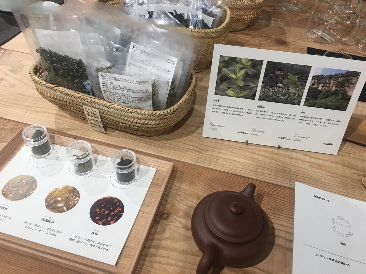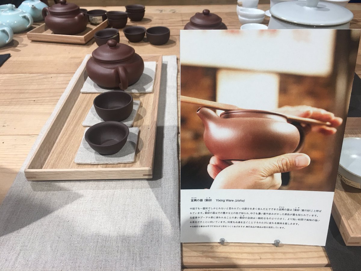 有楽町の無印良品、Found MUJIで中国茶と器を扱っている。景徳鎮の白磁、宜興紫砂、龍泉の青磁、みんな現地で新規に作らせてますねこれ。お茶も龍井と碧螺春と水仙、周辺の小道具も各種豊富な取り揃え、立派な冊子まで作って、なんだか本気だぞ… pic.twitter.com/cfmLIIO6lF 2018-09-29 20:28:00