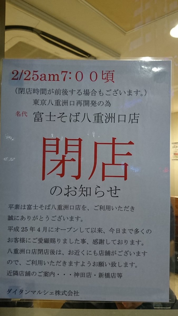 八重洲口店は2/25で閉店することになってます。閉店理由は再開発のためです。