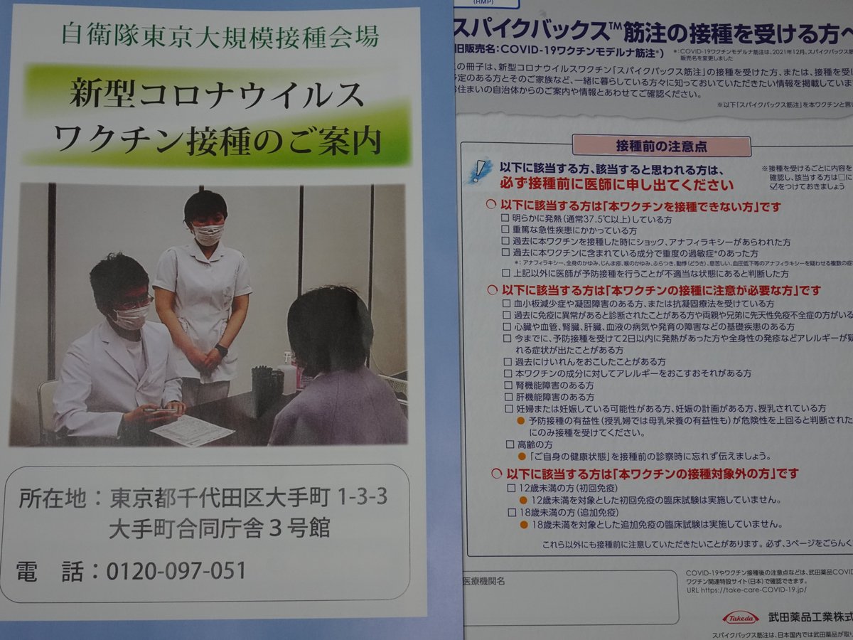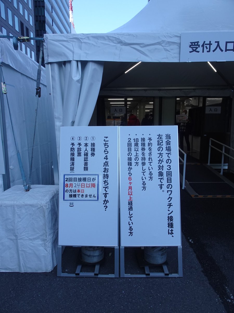 今日はワクチン追加接種(3回目)で大手町合同庁舎3号館へ。前回(9/9)から丁度半年。受付から接種、待機から撤収までは計30分(内、待機時間15分)。今回の出口は入口と逆(気象庁)側でした。3回共モデルナですが、今晩以降副反応が酷くならない事を祈るばかりです。 pic.twitter.com/ZOSSsMqPMW 2022-03-10 18:13:00