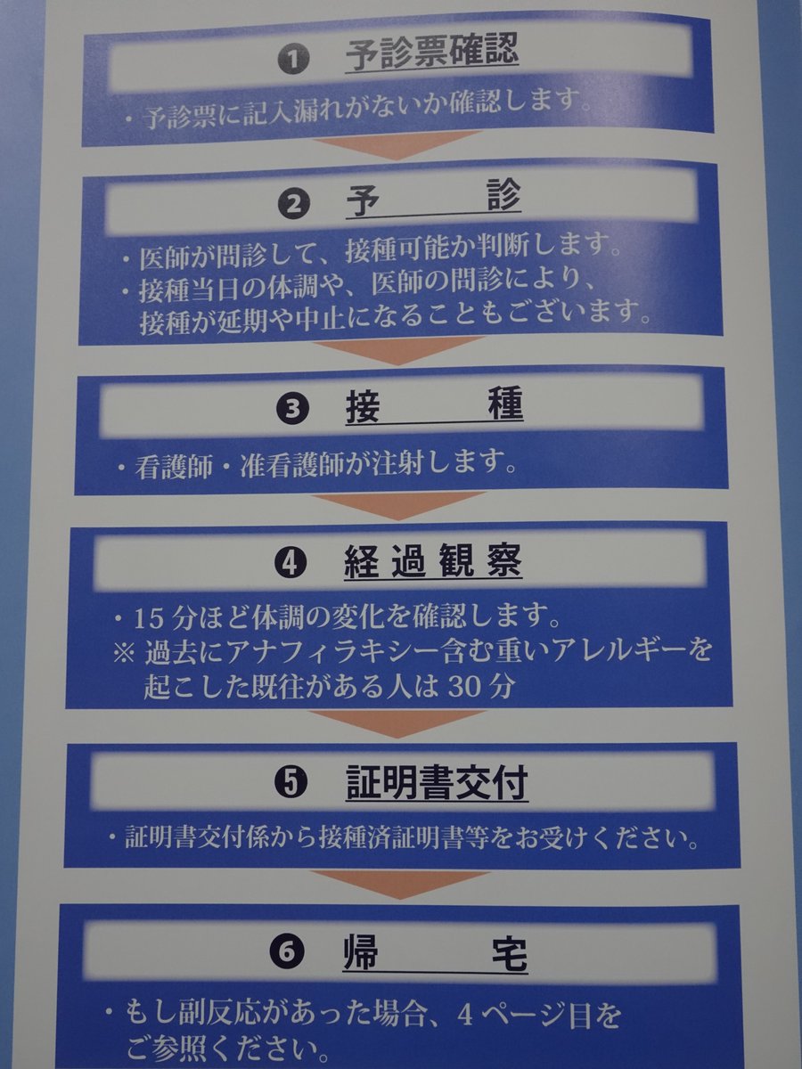 【受付、検温】→【予診票の確認】→【予診】→【接種】→【接種済票交付】→【経過観察】で大体1人30分程度かかります。