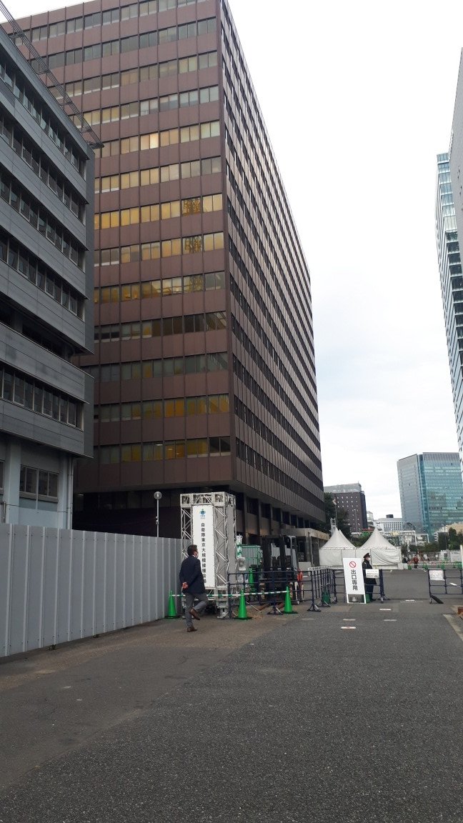 ワクチン接種会場、大手町合同庁舎3号館正面玄関前。こうして近くから見るとデカイです。現在出入りは反対側にあたる気象庁前からのようです